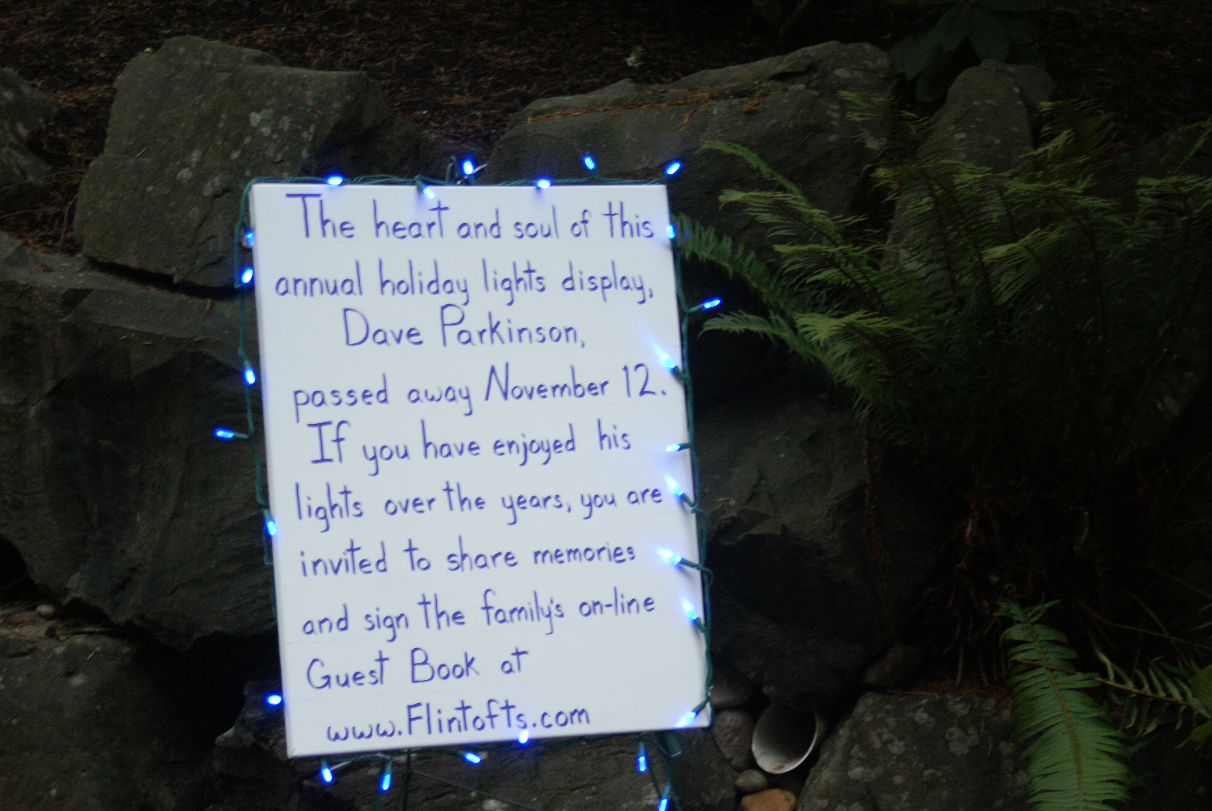 UPDATE January 2022: Ten years later Lisa still honors her husband’s memory with the annual holiday light display. How fitting that her/his display won this year’s Sammamish Independent’s competition. (Lisa Parkinson puts up holiday lights to keep husband’s memory alive.) Congratulations Lisa and thank you for continuing Dave’s legacy!
