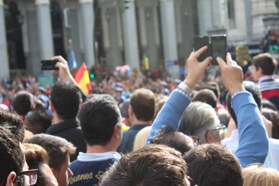 Peering over the crowds to get a glimpse of the parade.